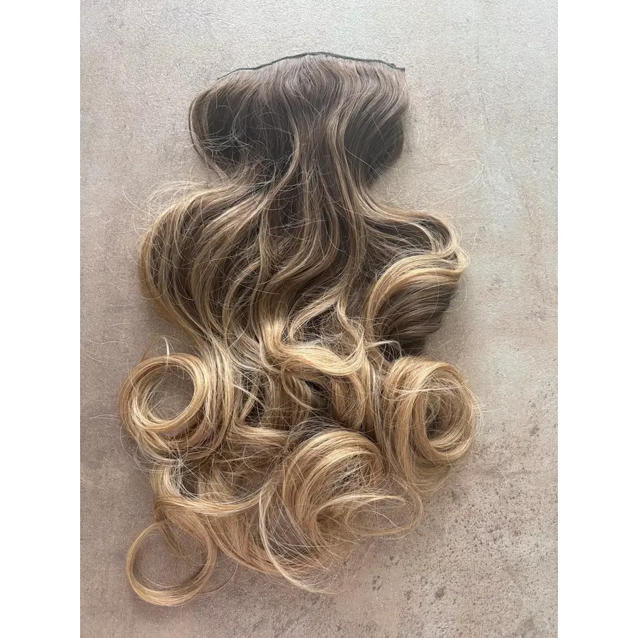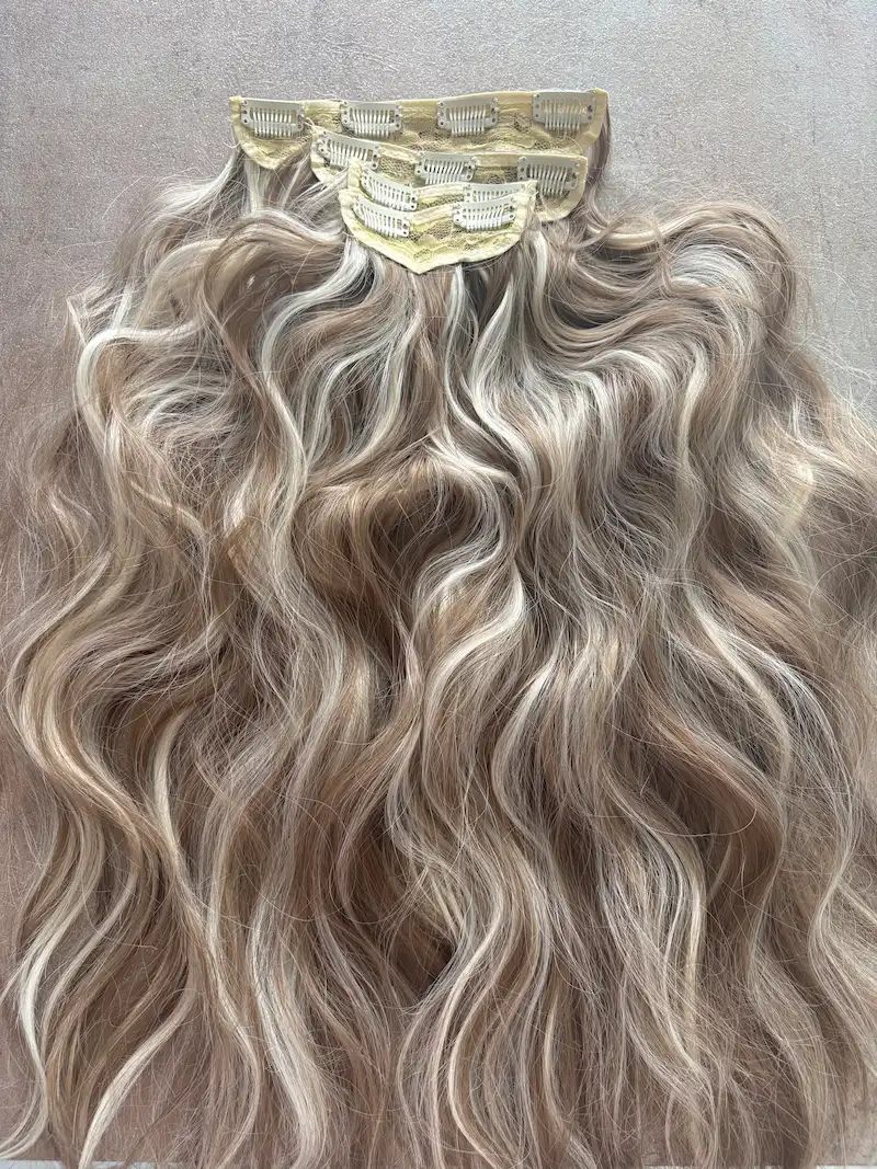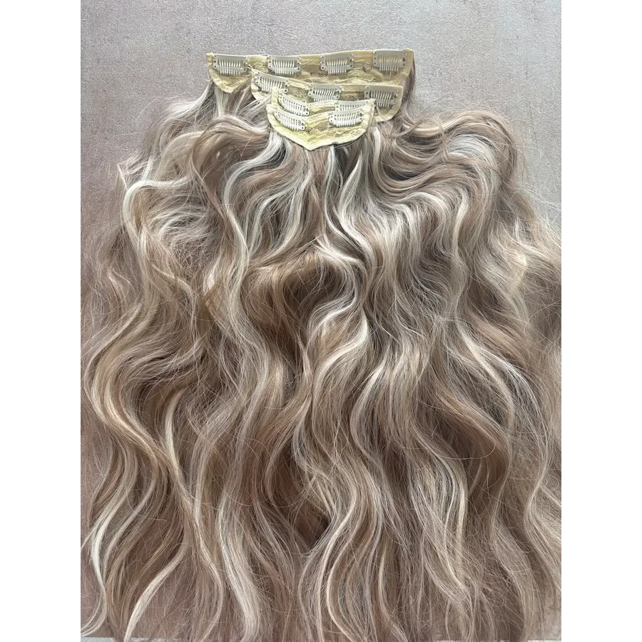 8-as szőke - hamvas szőke, melírozott, hullámos vasalható I. osztályú szintetikus csatos haj. 190-200gr, 50-55cm (63)