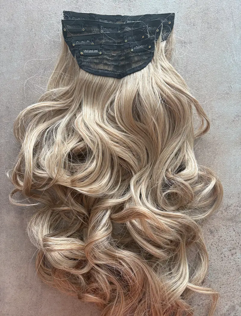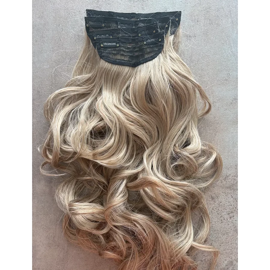 8-as szőke - szőke szálakkal, hullámos vasalható I. osztályú csatos 55-60cm szintetikus haj  180-200gr (68)